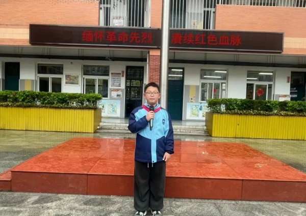 清晨,伴随着雄壮的《义勇军进行曲》,全体师生肃立齐唱,五星红旗冉冉升起,少先队员们行队礼,神情庄重。三(2)班学生代表以《缅怀革命先烈 賡续红色血脉》为题发表国旗下演讲。