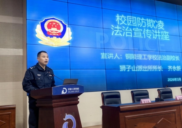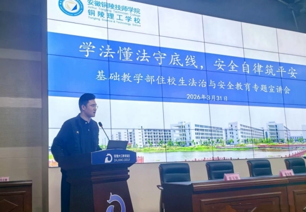 为进一步强化住校生法治意识与安全防范意识,规范日常行为习惯,筑牢校园安全防线,守护学生健康成长,3月31日,铜陵理工学校(安徽铜陵技师学院)基础教学部在综合楼九楼报告厅召开全体住校生法治教育暨安全教育宣讲会。该校校长杨益,学校法治副校长、狮子山派出所所长齐永新,校保卫科科长张少勇,基础教学部副主任章玉林,生活指导教师邓国栋以及基础教学部行政管理人员、全体住校生参会。会议由基础教学部党支部书记唐卫明主持。