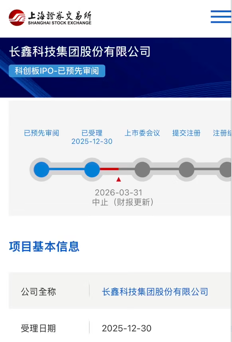 IT之家3月31日消息,有大量用户发现,国产 DRAM 制造商长鑫科技集团股份有限公司(下称“长鑫科技”)在上交所官网的科创板 IPO 审核状态已变更为“中止”。