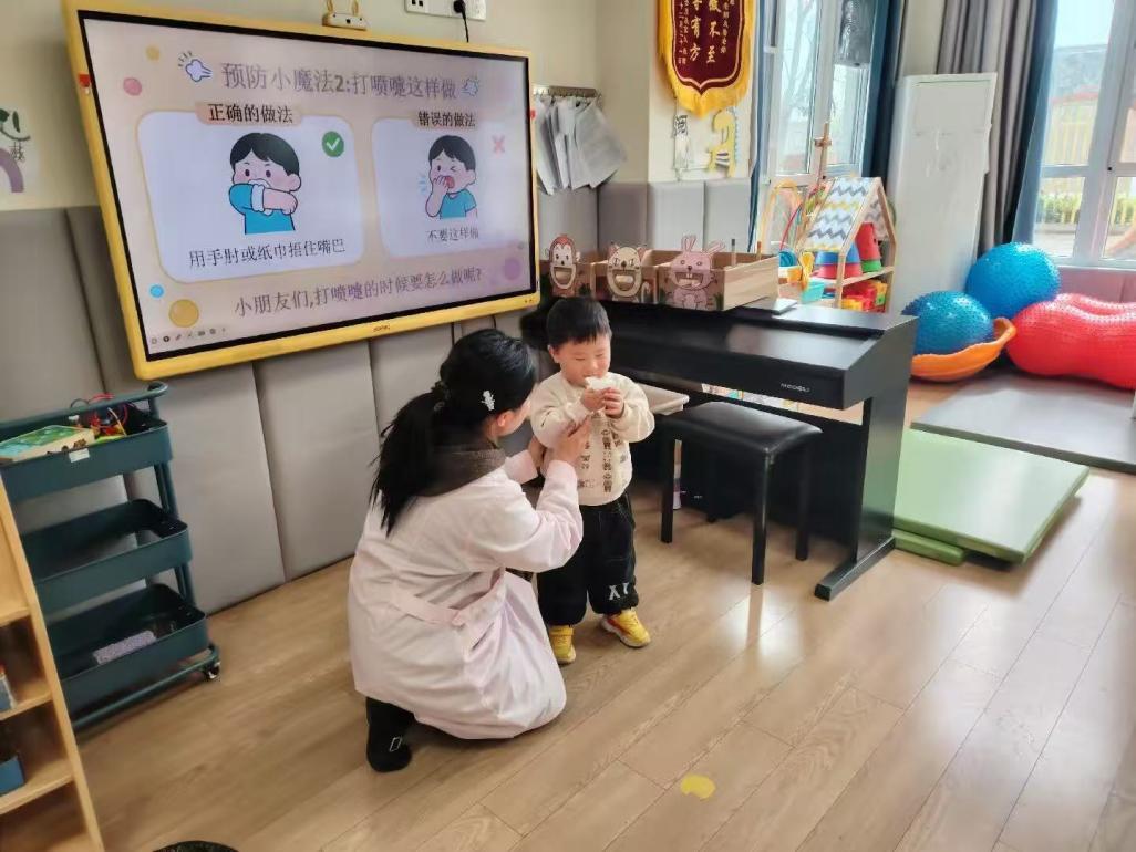 本次课程以儿童绘本风格为基调,贴合托班幼儿的认知特点,采用趣味讲解与互动实操相结合的形式,将生硬的防疫知识转化为宝贝们能听懂、能学会的小知识,让防护技能融入童趣时光。课堂上,保健医向宝贝们介绍了春季传染病的常见类型,帮助宝贝们直观认识这些“健康小敌人”;同时用通俗的语言讲解了传染病通过空气、接触、食物等途径传播的方式,让宝贝们了解“病菌会藏在哪里”。在七步洗手法互动环节,老师带着宝贝们边念口诀边动手操作,从“湿手、涂皂”到“搓洗、冲净、擦干”,一步步拆解动作,宝贝们跟着老师认真揉搓手心手背,将“勤洗手、洗好手”的习惯记在心间。在咳嗽礼仪学习中,保健医通过正确与错误做法的对比演示,教宝贝们打喷嚏、咳嗽时用手肘或纸巾捂住嘴巴,避免病菌传播,宝贝们积极模仿,快速掌握了这一实用小礼仪,逐渐成为守护自己的“健康小卫士”。