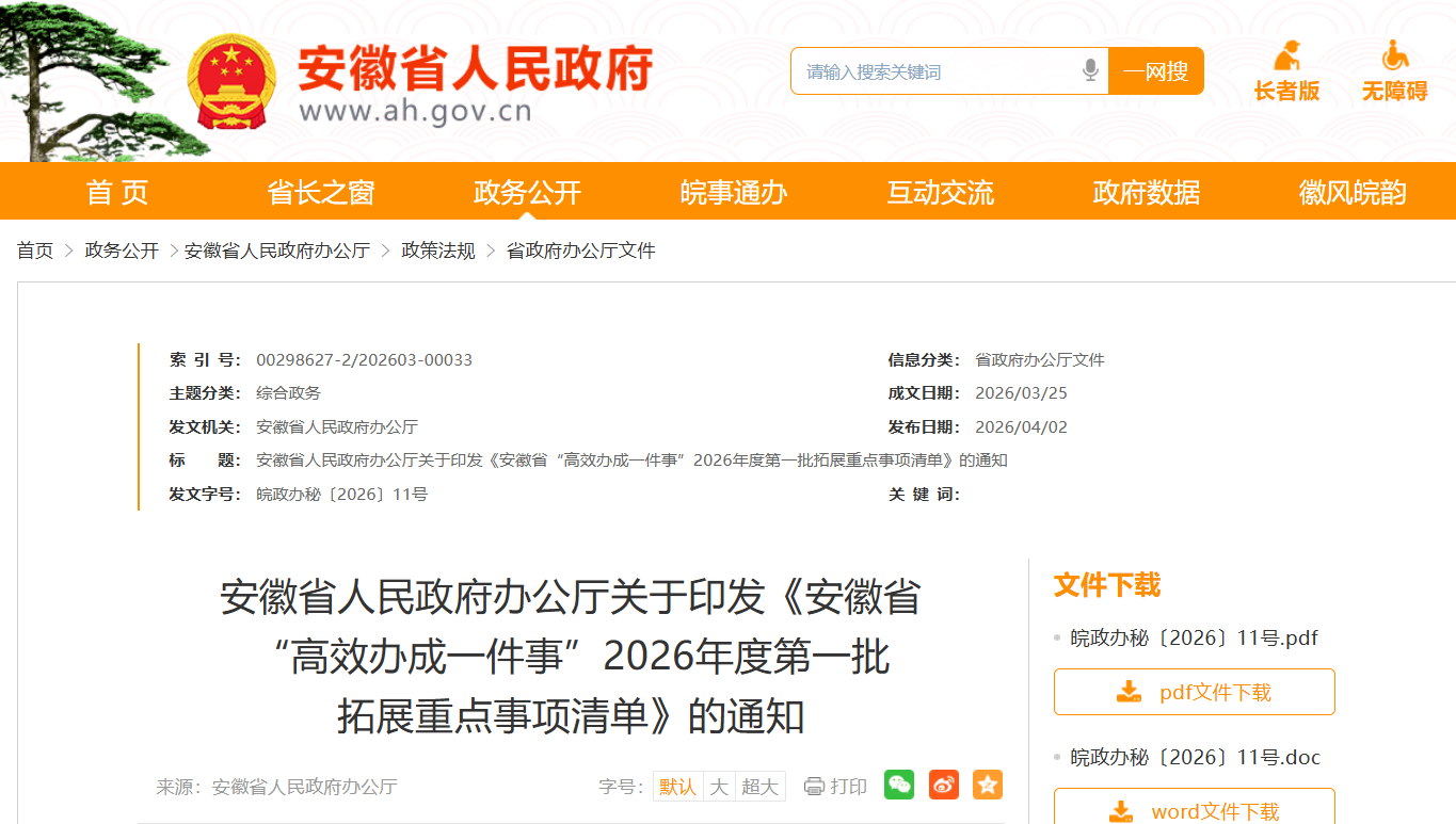 《安徽省“高效办成一件事”2026年度第一批拓展重点事项清单》已经省政府同意,现印发给你们,请结合实际认真组织实施。