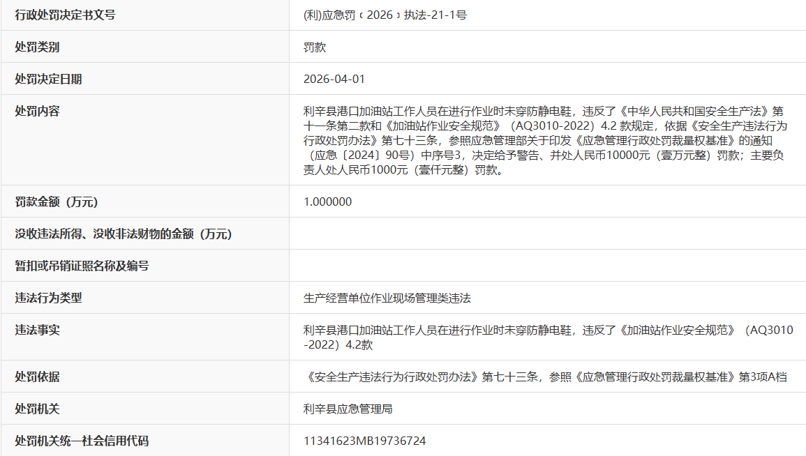 公开处罚信息显示,利辛县港口加油站工作人员在进行作业时未穿防静电鞋,违反了《中华人民共和国安全生产法》第十一条第二款和《加油站作业安全规范》(AQ3010-2022)4.2 款规定,依据《安全生产违法行为行政处罚办法》第七十三条,参照应急管理部关于印发《应急管理行政处罚裁量权基准》的通知(应急〔2024〕90号)中序号3,决定给予警告、并处人民币10000元(壹万元整)罚款;主要负责人处人民币1000元(壹仟元整)罚款。行政处罚决定书文号是(利)应急罚﹝2026﹞执法-21-1号。