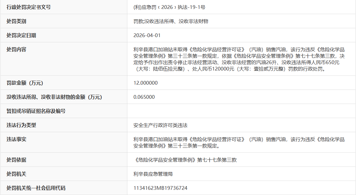 公开处罚信息显示,利辛县港口加油站未取得《危险化学品经营许可证》(汽油)销售汽油,该行为违反《危险化学品安全管理条例》第三十三条第一款规定,依据《危险化学品安全管理条例》第七十七条第三款,决定给予作出责令停止非法经营活动、没收非法经营的汽油26升、没收违法所得人民币650元(大写:陆佰伍拾元整)、处人民币120000元(大写:壹拾贰万元整)罚款的行政处罚。行政处罚决定书文号是(利)应急罚﹝2026﹞执法-19-1号。
