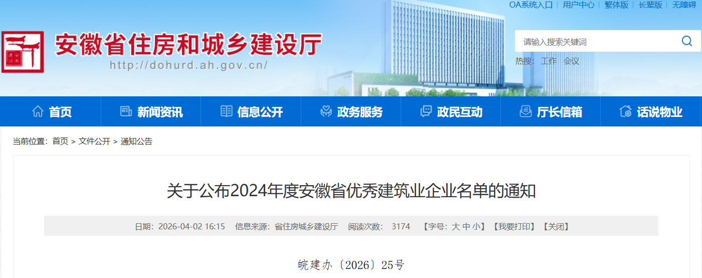 近日,安徽省住建厅官网发布关于公布2024年度安徽省优秀建筑业企业名单的通知,详情如下: