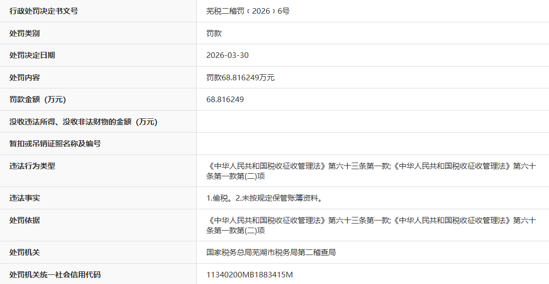 近日,据“信用安徽”公开披露行政处罚信息,因偷税、未按规定保管账簿资料,无为县蜀山镇泊山加油站被处以罚款68.816249万元。行政处罚决定书文号是芜税二稽罚﹝2026﹞6号。