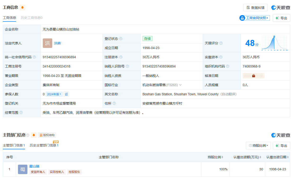 天眼查信息显示,无为县蜀山镇泊山加油站,成立于1998年,位于安徽省芜湖市,是一家以从事零售业为主的企业,经营范围包含柴油、车用乙醇汽油、润滑油零售等。风险方面发现企业有开庭公告1条。该加油站实际控制人、控股股东为蜀山镇。