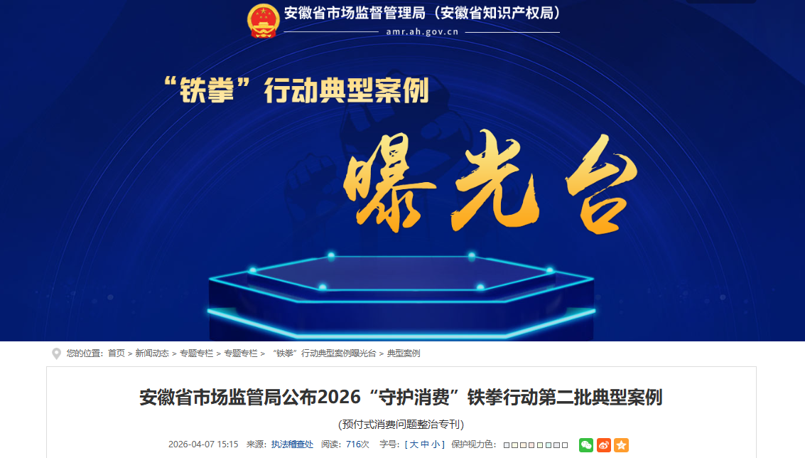 4月7日,安徽省市场监管局公布2026“守护消费”铁拳行动第二批典型案例(预付式消费问题整治专刊),详情如下:
