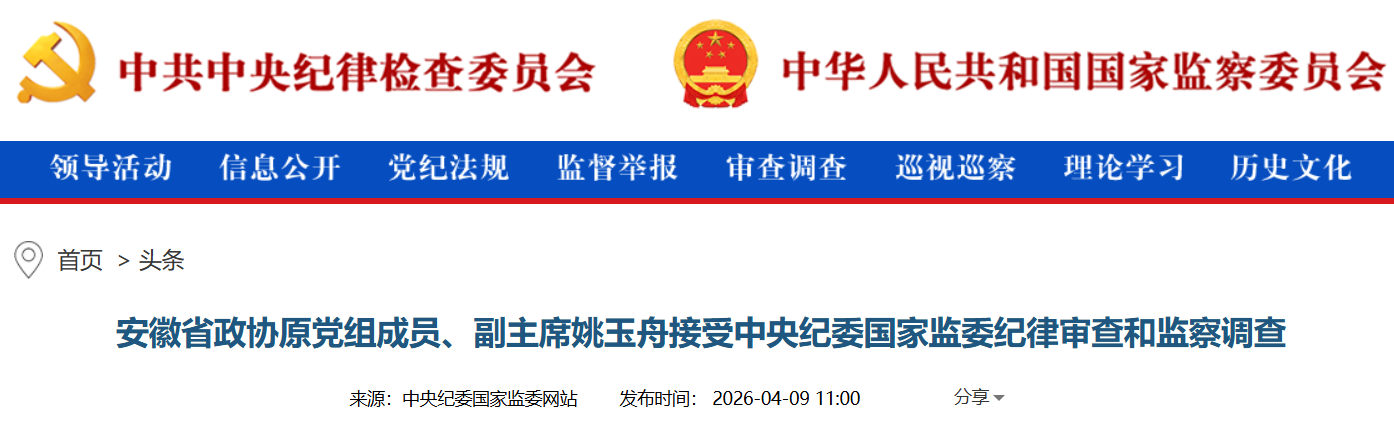 中央纪委国家监委网站4月9日消息,安徽省政协原党组成员、副主席姚玉舟涉嫌严重违纪违法,目前正接受中央纪委国家监委纪律审查和监察调查。