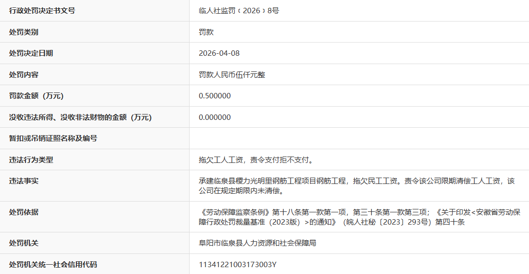 近日,据“信用安徽”公开披露行政处罚信息,因拖欠工人工资,责令支付拒不支付,滁州硕恒建筑劳务有限公司被处以罚款5000元。行政处罚决定书文号是临人社监罚﹝2026﹞8号。