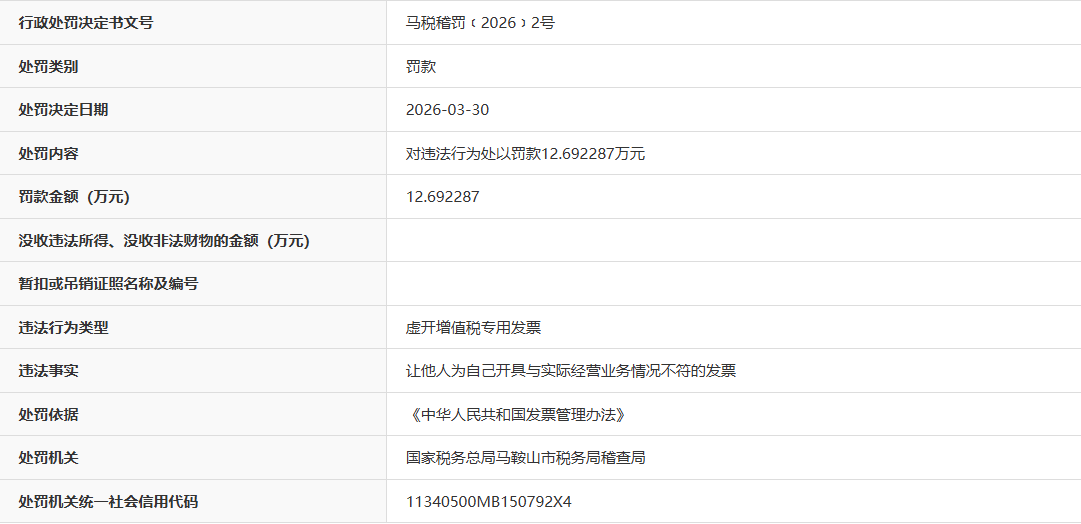 近日,据“信用安徽”公开披露行政处罚信息,因虚开增值税专用发票,马鞍山市百事达服装制造有限公司被处以罚款12.692287万元。行政处罚决定书文号是马税稽罚﹝2026﹞2号。
