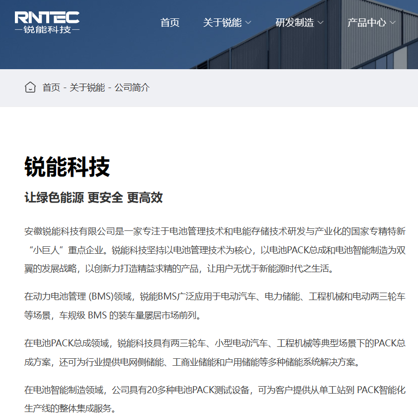 锐能科技官网信息显示,安徽锐能科技有限公司是一家专注于电池管理技术和电能存储技术研发与产业化的国家专精特新“小巨人”重点企业。锐能科技坚持以电池管理技术为核心,以电池PACK总成和电池智能制造为双翼的发展战略,以创新力打造精益求精的产品,让用户无忧于新能源时代之生活。在动力电池管理 (BMS)领域,锐能BMS广泛应用于电动汽车、电力储能、工程机械和电动两三轮车等场景,车规级 BMS 的装车量屡居市场前列。