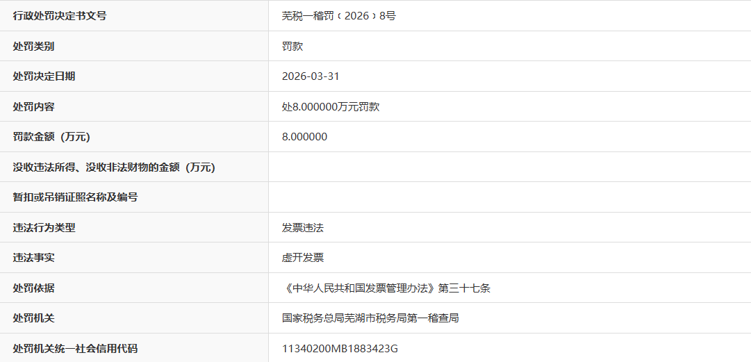 近日,据“信用安徽”公开披露行政处罚信息,因虚开发票,芜湖顺祥航运有限公司被处以罚款8万元。行政处罚决定书文号是芜税一稽罚﹝2026﹞8号。