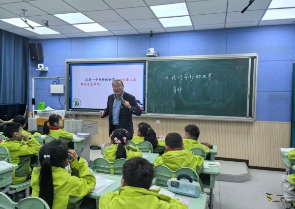 第二节课是副校长韩胜飞执教三年级《奇妙的世界》,韩胜飞紧扣文本核心,引导学生探寻世界的奇妙,从天空、大地两个方面切入,注重朗读指导与联想拓展,学生明白了生活中我们需要仔细观察、认真寻找,学生在语言实践中感受文字之美、自然之妙,落实语文核心素养培育的要求。
