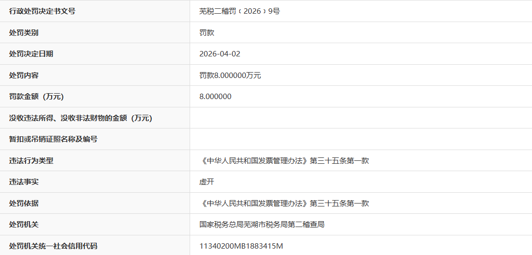 近日,据“信用安徽”公开披露行政处罚信息,因虚开发票,芜湖创顺商贸有限公司被处以罚款8万元。行政处罚决定书文号是芜税二稽罚﹝2026﹞9号。