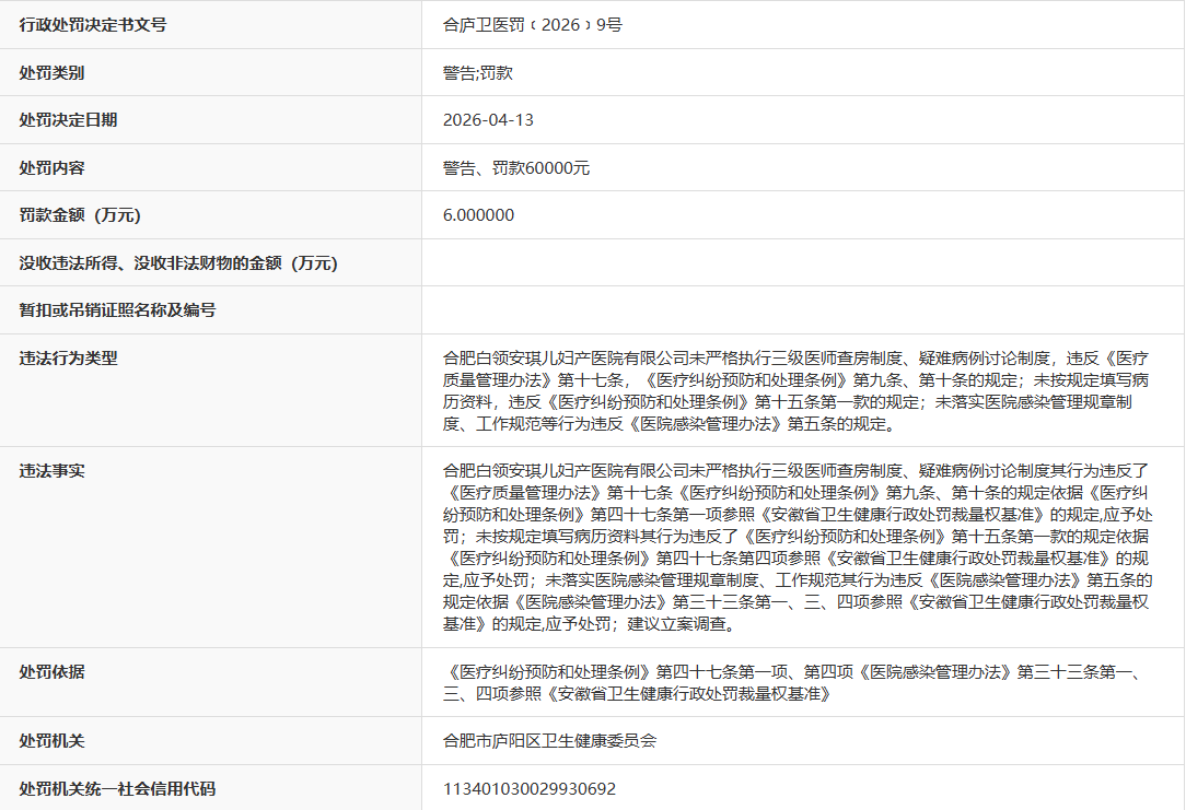 近日,据“信用安徽”公开披露行政处罚信息,因未严格执行多项医疗管理制度,合肥白领安琪儿妇产医院有限公司被处以警告并罚款6万元。行政处罚决定书文号是合庐卫医罚﹝2026﹞9号。
