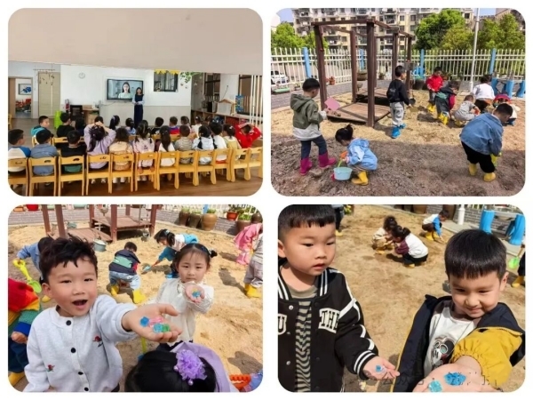 孩子们化身小小矿工,戴好工具、挽起衣袖,迫不及待地投入到挖矿任务中。大家蹲在沙池里,小心翼翼地用小铲子、小耙子挖掘沙土,仔细寻找藏在沙子里的“宝藏矿石”,时不时传来“我找到矿石啦”的惊喜欢呼声。