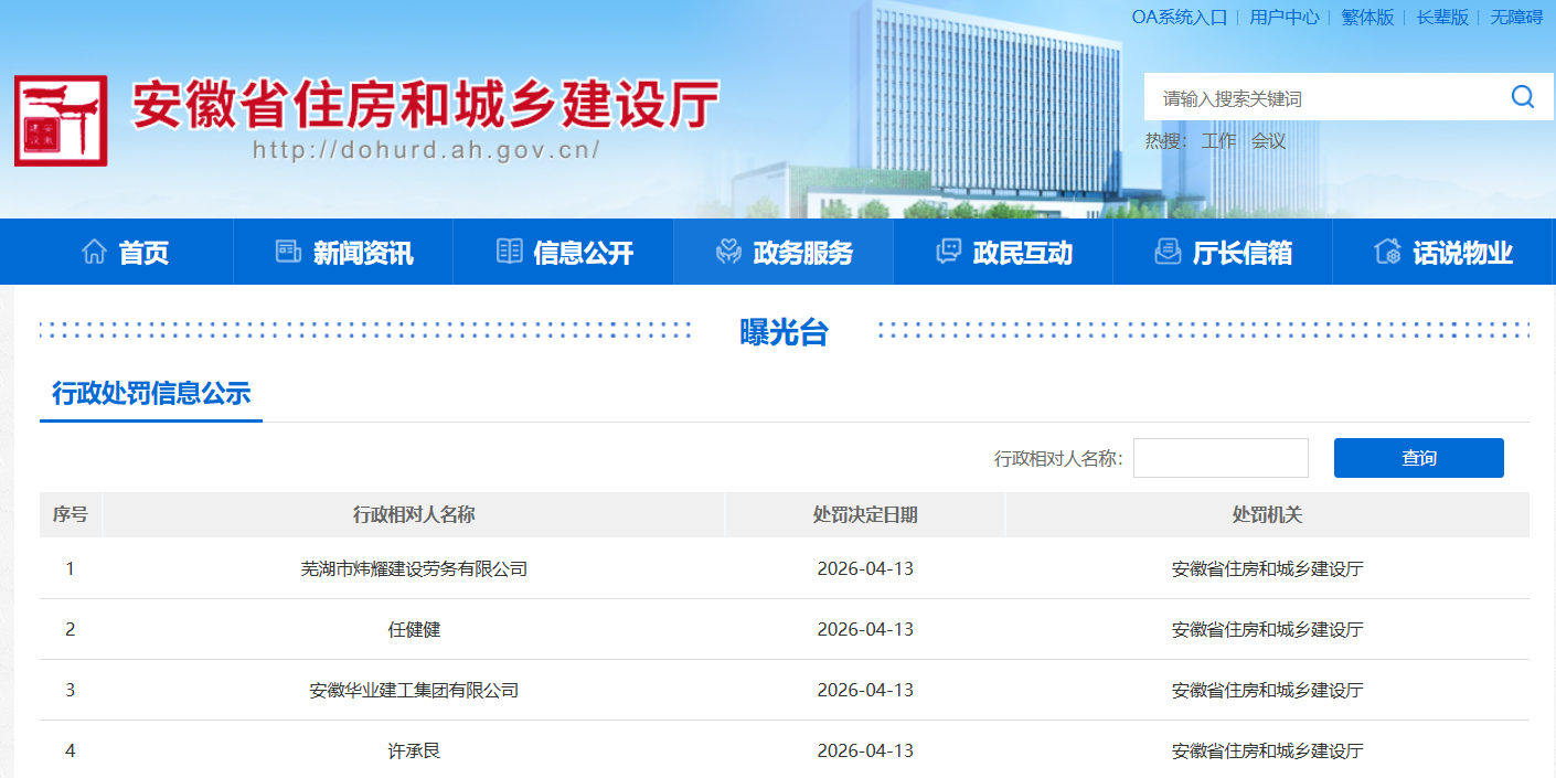 近日,据“安徽省住建厅”公开披露行政处罚信息,因对江西省南昌市新建区中南高科项目二期“2024.10.13”生产安全事故负有责任,安徽华业建工集团有限公司、芜湖市炜耀建设劳务有限公司以及相关责任人任健健、许承艮被罚。详情如下:
