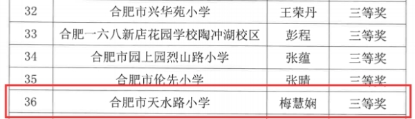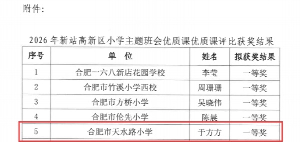 春风传喜讯,赛场展风采。在合肥新站高新区教育教研室组织开展的2026年新站高新区小学主题班会优质课评比活动中,合肥市天水路小学(幼专附小)教师于方方和梅慧娴凭借扎实的专业能力与精彩的现场表现,荣获1个一等奖、1个三等奖,为学校再添光彩。