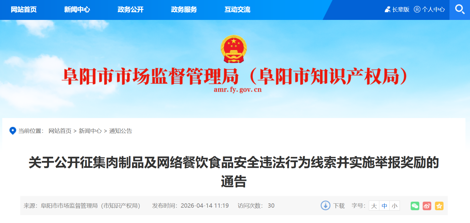 4月14日,阜阳市市场监督管理局发布关于公开征集肉制品及网络餐饮食品安全违法行为线索并实施举报奖励的通告,详情如下: