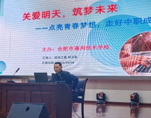 为深入推进职业教育,引导学生树立正确价值观,4月14日,合肥市通用技术学校精心举办“关爱明天大讲堂”专题教育活动。本次讲座特邀学校关心下一代工作委员会副主任钟卫东担任主讲,25级师生到场聆听学习。
