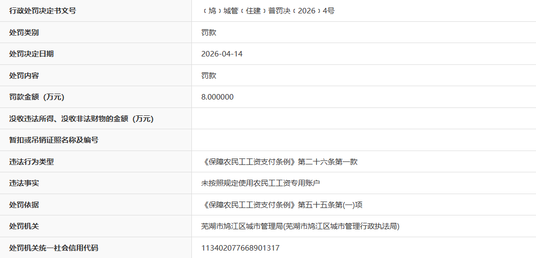 近日,据“信用安徽”公开披露行政处罚信息,因未按照规定使用农民工工资专用账户,安徽省无为县开城建筑工程有限公司被处以罚款8万元。行政处罚决定书文号是﹝鸠﹞城管﹝住建﹞普罚决﹝2026﹞4号。