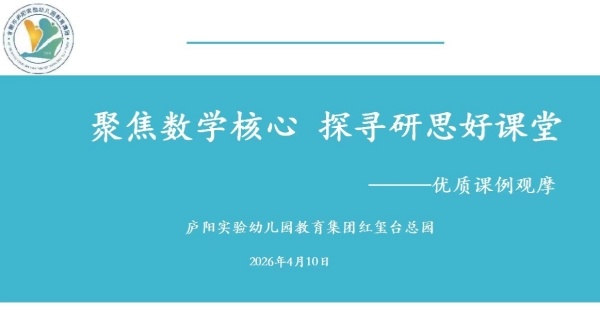 为深入贯彻《3-6岁儿童学习与发展指南》精神,推进“合肥好课堂”建设,提升教师数学领域教学能力,4月10日,合肥市庐阳实验幼儿园教育集团红玺台总园开展了以“聚焦数学核心 探寻研思好课堂”为主题的教研活动。全体教师齐聚一堂,通过课例观摩、分组研讨、外出学习反馈等形式,共研数学活动设计与组织策略。