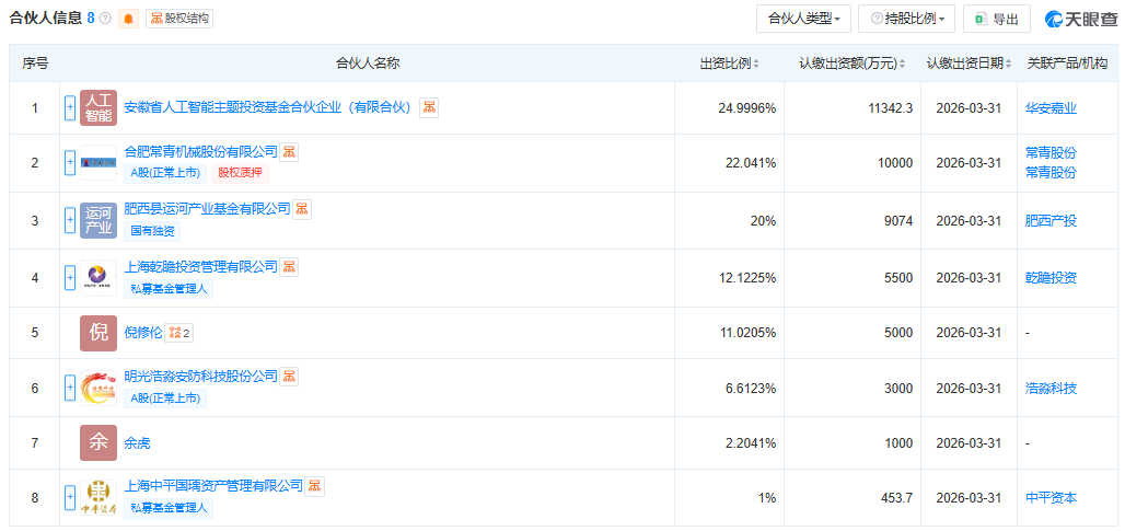 合伙人信息显示,该企业由安徽省人工智能主题投资基金合伙企业(有限合伙)、合肥常青机械股份有限公司、肥西县运河产业基金有限公司、明光浩淼安防科技股份公司、上海乾瞻投资管理有限公司等共同出资成立。