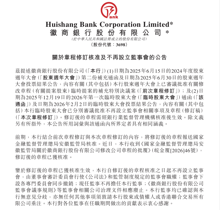 公告指出,鉴于修订后的章程已获核准生效,该行自修订后的章程核准之日起不再设立监事会,由董事会审计委员会行使《公司法》和监管制度规定的监事会职权;监事会下设各专门委员会同步撤销;现任监事不再担任该行监事;《徽商银行股份有限公司监事会议事规则》等监事会相关公司治理文件相应废止。