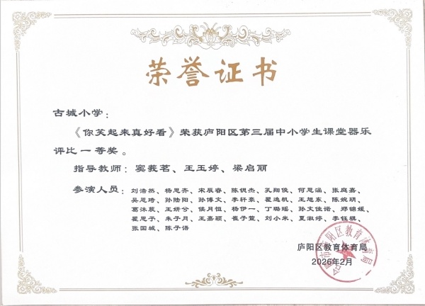 合肥市古城小学地处庐阳区三十岗乡,作为一所全区师生规模最小的学校,能够连续在庐阳区课堂器乐评比中斩获佳绩,充分体现了学校“以体艺育人、促进学生全面发展”的坚定信念与扎实成效。学校将继续秉持“让每个生命都绽放光彩”的办学理念,以此次获奖为契机,继续深化艺术教育实践,推进少年宫文化建设,在庐阳区“985”工作体系的引领下,为每一位乡村孩子的健康成长与全面发展保驾护航,让优美的葫芦丝旋律在庐阳大地上继续悠扬传唱。(图文/王玉婷)