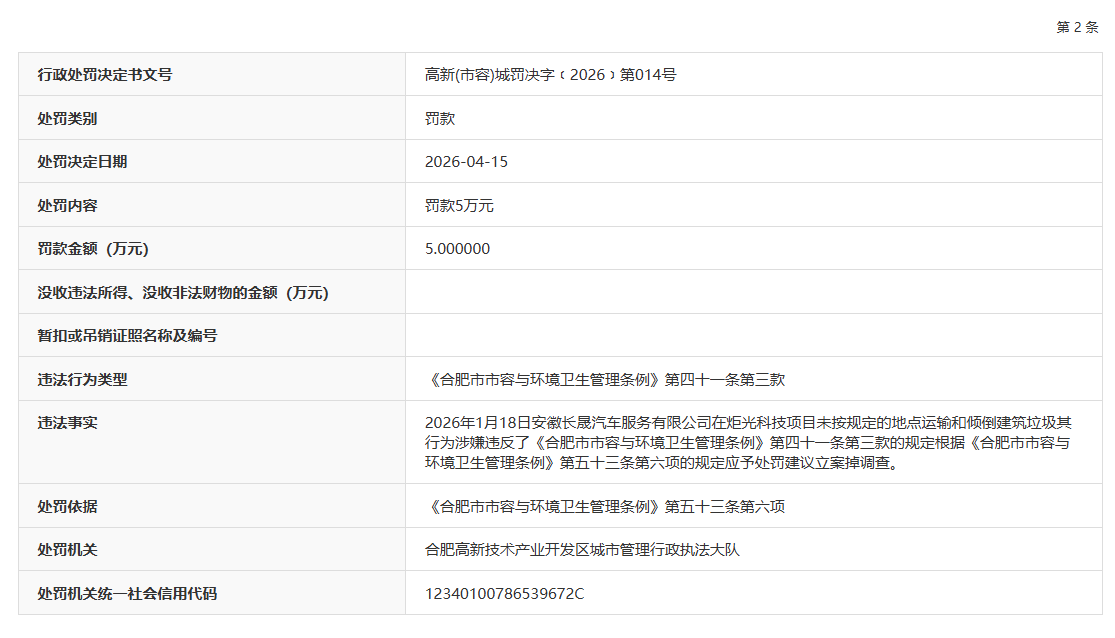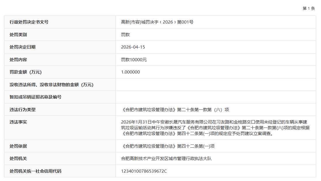 公开处罚信息显示,2026年1月31日中午安徽长晟汽车服务有限公司在习友路和金桂路交口使用未经登记的车辆从事建筑垃圾运输活动,其行为涉嫌违反了《合肥市建筑垃圾管理办法》第二十条第一款第(六)项的规定,根据《合肥市建筑垃圾管理办法》第四十二条第(一)项的规定应予处罚,合肥高新技术产业开发区城市管理行政执法大队建议立案调查并作出罚款1万元的行政处罚决定。