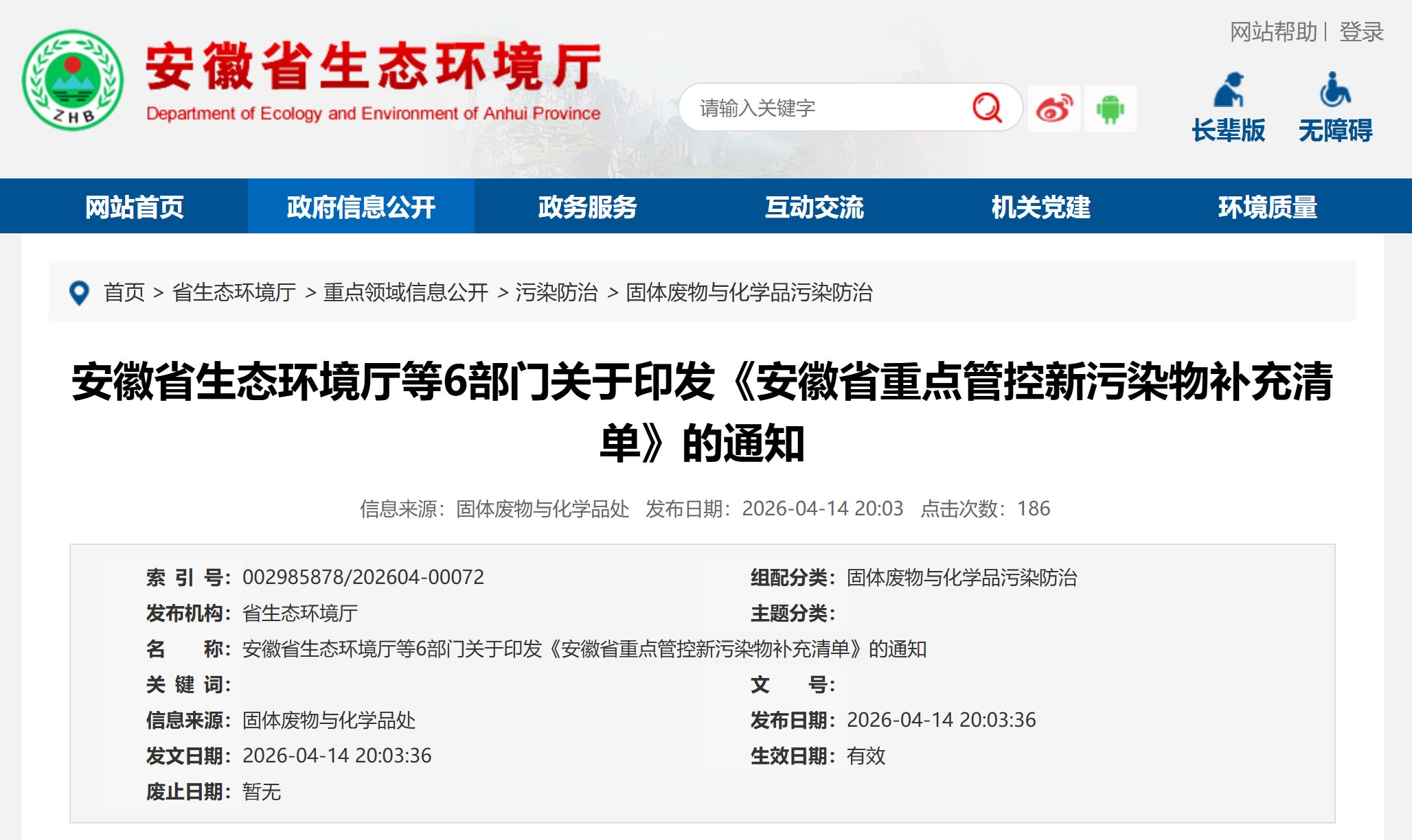 近日,安徽省生态环境厅等6部门印发《安徽省重点管控新污染物补充清单》。