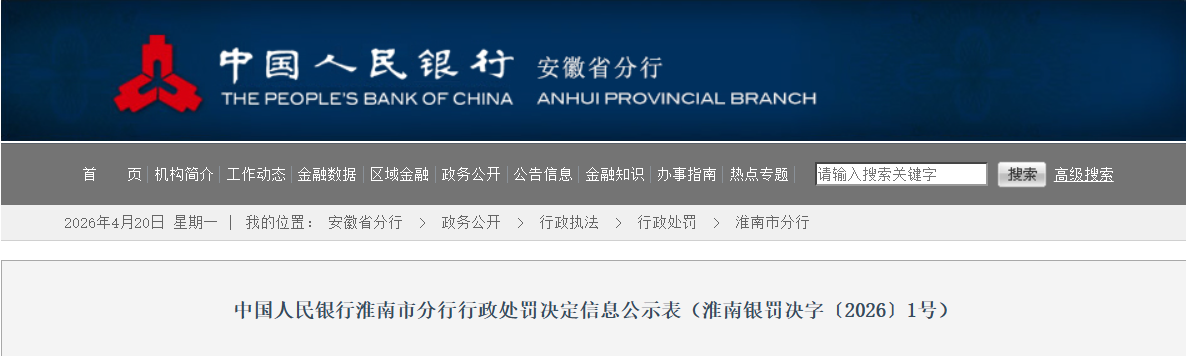 近日,据“中国人民银行安徽省分行”公开披露行政处罚信息,中国建设银行股份有限公司淮南市分行被警告并处以六十三万元人民币罚款。行政处罚决定书文号是淮南银罚决字〔2026〕1号。