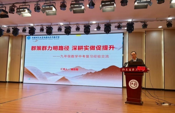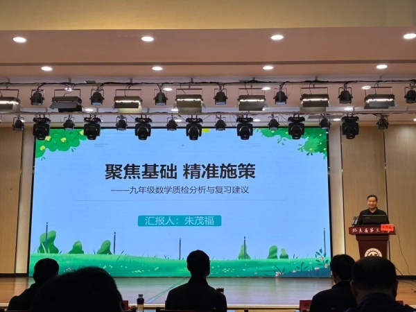 会议围绕“聚焦基础、精准施策、系统备考”主题展开。合肥市第四十五中学宝翠园分校朱茂福老师首先作《聚焦基础 精准施策——九年级数学质检分析与复习建议》专题讲座。他结合本次检测数据,从试卷难度、信度、区分度等方面进行专业分析,梳理了学生在函数、几何、统计等板块的典型失分点,并提出了“以课标为依据、以教材为根本、以素养为导向”的复习建议,强调复习要回归课本、夯实基础、强化思维。