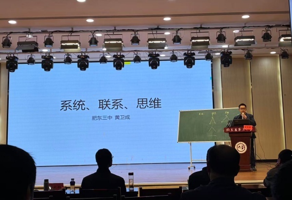 随后,肥东圣泉中学舒迎春老师、安师大附属肥东实验中学陈志刚老师、安师大附属肥东实验学校谢俊老师分别围绕“以研赋能、以教提质、以管护航”“群策群力明路径,深耕实做促提升”“回归教育本真,深耕‘在场’课堂”等主题,分享了各自学校在集体教研、课堂实践、分层教学、作业设计等方面的备考经验。肥东三中黄卫成老师以《系统·联系·思维》为题,从数学学科本质出发,强调复习应注重知识结构化、思维逻辑化,引导学生构建完整的知识网络。