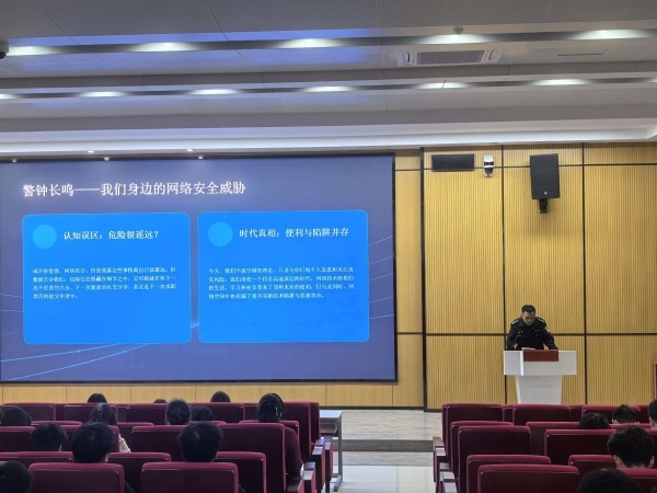 专题讲座强意识,安全知识入人心。同日下午,安全管理处邀请池州市公安局网安支队专家,在公共教学楼东报告厅举办国家安全教育日安全知识专题讲座。全校11个二级学院的220名班级安全员参加培训。讲座聚焦网络安全、反奸防谍、反诈防骗、意识形态安全等重点内容,结合典型案例剖析与安全知识讲解,有效提升学生骨干的风险防范意识和应急处置能力,推动国家安全教育走进班级、深入宿舍。