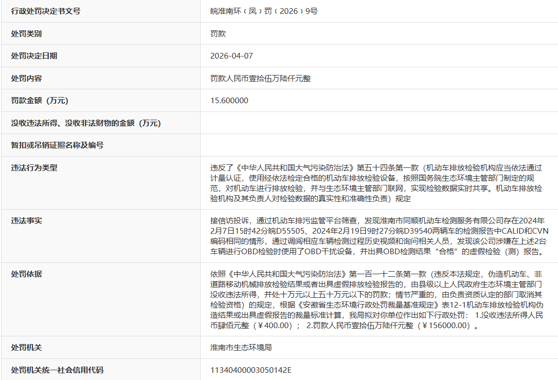 近日,据“信用安徽”公开披露行政处罚信息,因涉嫌在2台车辆进行OBD检验时使用了OBD干扰设备,并出具OBD检测结果“合格”的虚假检验(测)报告,淮南市同顺机动车检测服务有限公司被处以罚款15.6万元,被没收违法所得400元。行政处罚决定书文号是皖淮南环﹝凤﹞罚﹝2026﹞9号。