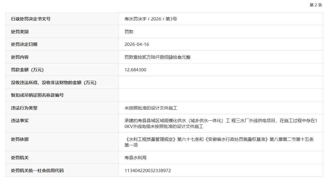 安徽勇创能源科技有限公司承建的寿县县域区域规模化供水(城乡供水一体化)工程三水厂外线供电项目,在施工过程中存在10KV外线电缆未按照批准的设计文件施工。依据《水利工程质量管理规定》第六十七条和《安徽省水行政处罚裁量权基准》第八章第二节第十五条第一项,安徽勇创能源科技有限公司被处以罚款12.6843万元。行政处罚决定书文号是寿水罚决字﹝2026﹞第3号。