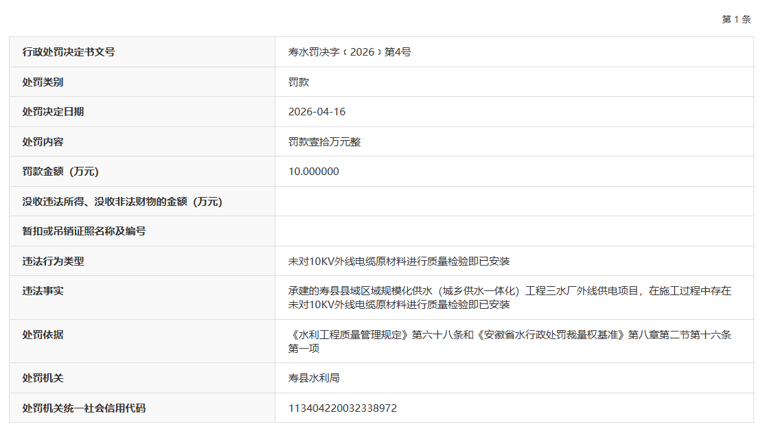 安徽勇创能源科技有限公司承建的寿县县域区域规模化供水(城乡供水一体化)工程三水厂外线供电项目,在施工过程中存在未对10KV外线电缆原材料进行质量检验即已安装。依据《水利工程质量管理规定》第六十八条和《安徽省水行政处罚裁量权基准》第八章第二节第十六条第一项,安徽勇创能源科技有限公司被处以罚款10万元。行政处罚决定书文号是寿水罚决字﹝2026﹞第4号。