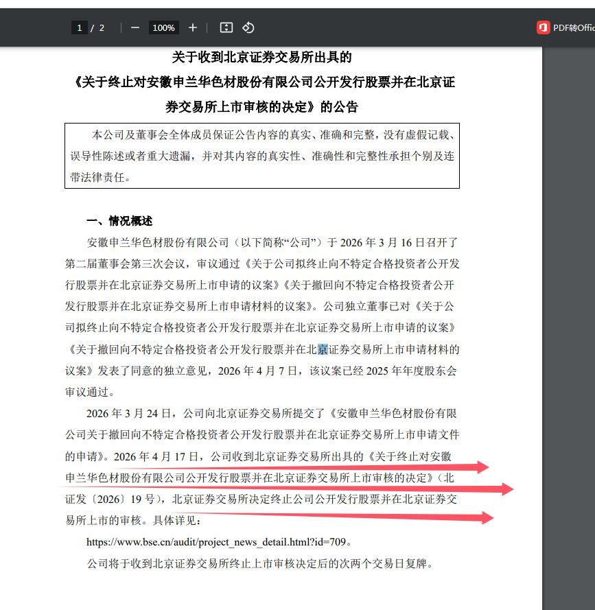 该决定很快获得监管层面的回应。2026年4月17日,公司正式收到北交所出具的《关于终止对安徽申兰华色材股份有限公司公开发行股票并在北京证券交易所上市审核的决定》,上市审核就此正式终止,标志着公司本次北交所IPO之旅彻底落幕。
