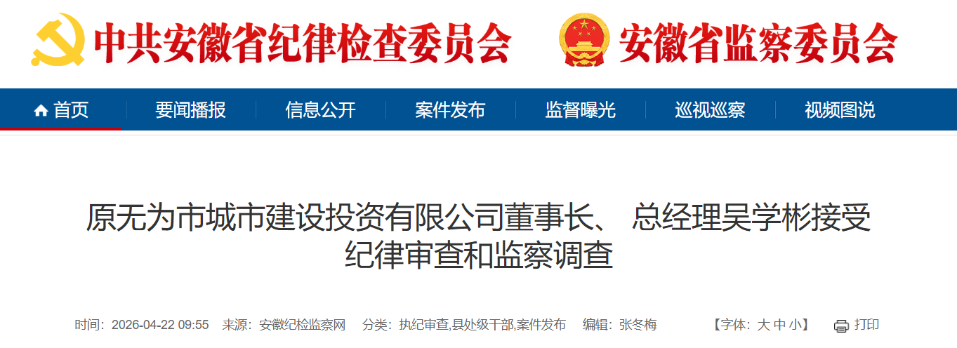 原无为市城市建设投资有限公司董事长、总经理吴学彬涉嫌严重违纪违法,目前正接受无为市纪委监委纪律审查和监察调查。(无为市纪委监委)