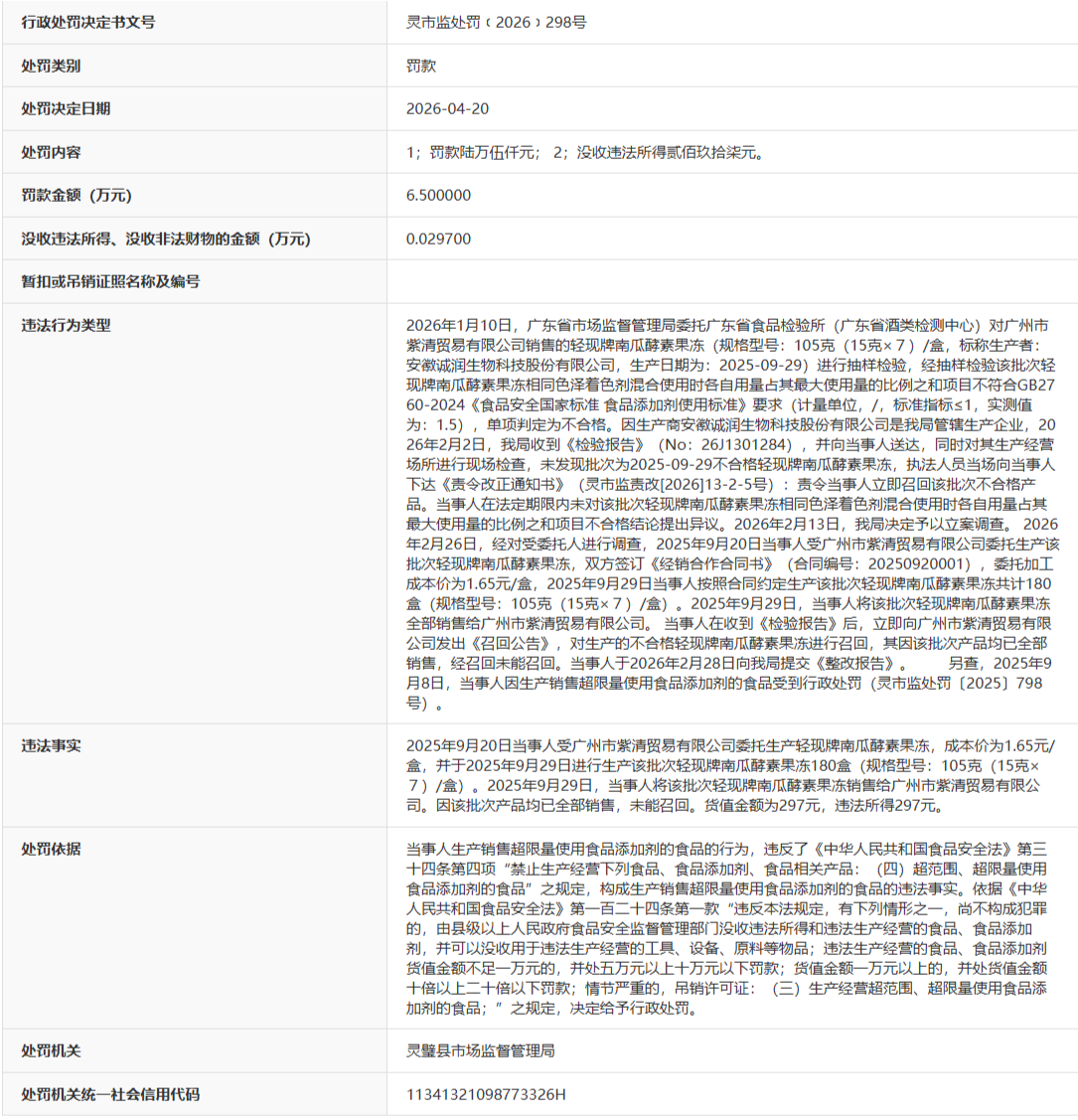 公开处罚信息显示,2026年1月10日,广东省市场监督管理局委托广东省食品检验所(广东省酒类检测中心)对广州市紫清贸易有限公司销售的轻现牌南瓜酵素果冻(规格型号:105克(15克×7)/盒,标称生产者:安徽诚润生物科技股份有限公司,生产日期为:2025-09-29)进行抽样检验,经抽样检验该批次轻现牌南瓜酵素果冻相同色泽着色剂混合使用时各自用量占其最大使用量的比例之和项目不符合GB2760-2024《食品安全国家标准食品添加剂使用标准》要求(计量单位,/,标准指标≤1,实测值为:1.5),单项判定为不合格。因生产商安徽诚润生物科技股份有限公司是我局管辖生产企业,2026年2月2日,灵璧县市场监督管理局收到《检验报告》(No:26J1301284),并向当事人送达,同时对其生产经营场所进行现场检查,未发现批次为2025-09-29不合格轻现牌南瓜酵素果冻,执法人员当场向当事人下达《责令改正通知书》(灵市监责改[2026]13-2-5号):责令当事人立即召回该批次不合格产品。当事人在法定期限内未对该批次轻现牌南瓜酵素果冻相同色泽着色剂混合使用时各自用量占其最大使用量的比例之和项目不合格结论提出异议。2026年2月13日,灵璧县市场监督管理局决定予以立案调查。 2026年2月26日,经对受委托人进行调查,2025年9月20日当事人受广州市紫清贸易有限公司委托生产该批次轻现牌南瓜酵素果冻,双方签订《经销合作合同书》(合同编号:20250920001),委托加工成本价为1.65元/盒,2025年9月29日当事人按照合同约定生产该批次轻现牌南瓜酵素果冻共计180盒(规格型号:105克(15克×7)/盒)。2025年9月29日,当事人将该批次轻现牌南瓜酵素果冻全部销售给广州市紫清贸易有限公司。当事人在收到《检验报告》后,立即向广州市紫清贸易有限公司发出《召回公告》,对生产的不合格轻现牌南瓜酵素果冻进行召回,其因该批次产品均已全部销售,经召回未能召回。当事人于2026年2月28日向我局提交《整改报告》。另查,2025年9月8日,当事人因生产销售超限量使用食品添加剂的食品受到行政处罚(灵市监处罚〔2025〕798号)。