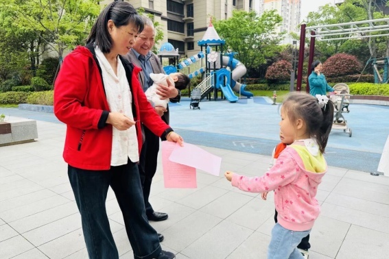 活动期间,吾悦分园的小班和中班幼儿以混龄结对形式开展社区环保实践活动。在教师与家长志愿者的陪同下,幼儿走进小区公园捡拾垃圾,学习简易垃圾分类方法,在合作实践中增强环保责任意识。幼儿还化身环保宣传员,向社区居民发放环保宣传单,呼吁大家爱护环境、做好垃圾分类。