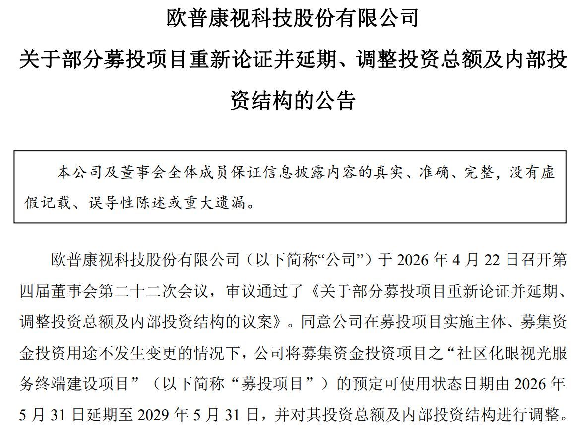 4月22日,欧普康视召开董事会会议,审议通过了《关于部分募投项目重新论证并延期、调整投资总额及内部投资结构的议案》,同意公司在募投项目实施主体、募集资金投资用途不发生变更的情况下,公司将募集资金投资项目之“社区化眼视光服务终端建设项目”的预定可使用状态日期由2026年5月31日延期至2029年5月31日,并对其投资总额及内部投资结构进行调整。本次事项尚需提交股东会审议。