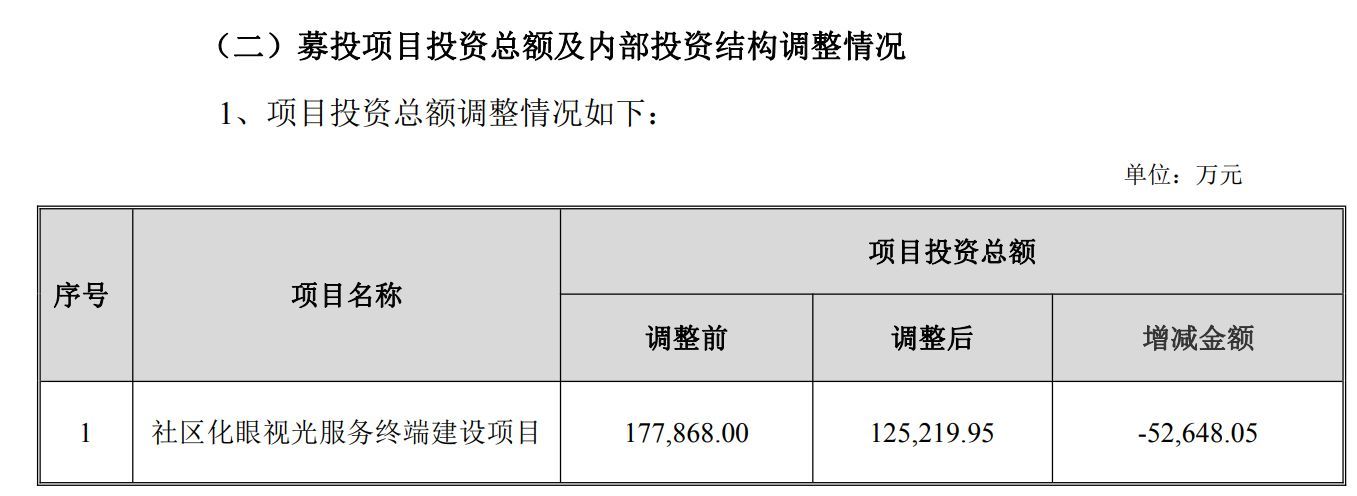 除了延期,该项目的投资结构也发生明显转向。公告显示,“社区化眼视光服务终端建设项目”投资总额由约17.79亿元下调至约12.52亿元,减少约5.26亿元。其中,固定资产投资由约16.37亿元大幅降至约2.33亿元,减少约14.04亿元。