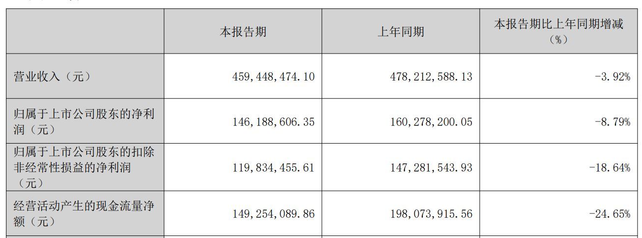 财报显示,欧普康视一季度实现营业收入约4.59亿元,相较于去年同期的4.78亿元,同比下降3.92%;归母净利润1.46亿元,同比下降8.79%;在剔除理财收益等非经常性损益后,更能反映主营业务盈利能力的扣非净利润约1.20亿元,同比下降18.64%。