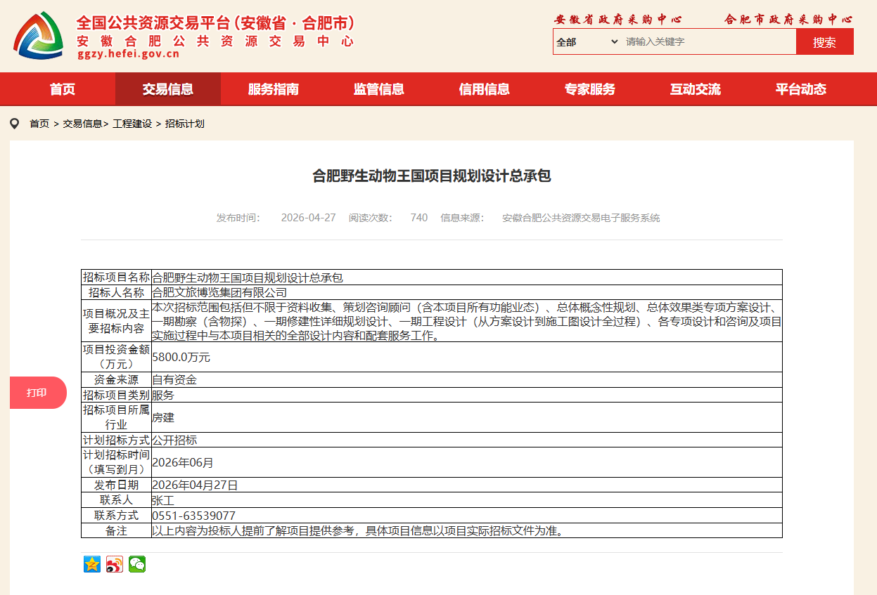 4月27日,安徽合肥公共资源交易中心一则“合肥野生动物王国项目规划设计总承包”招标计划引发广泛关注。虽然名称中未直接使用“野生动物园”字样,但其内容与市民期盼多年的合肥市新野生动物园高度吻合,也成为自今年3月6日庐江县冶父山镇释放“全力保障项目落地”信号以来,官方平台再度发布的实质性推进信息。